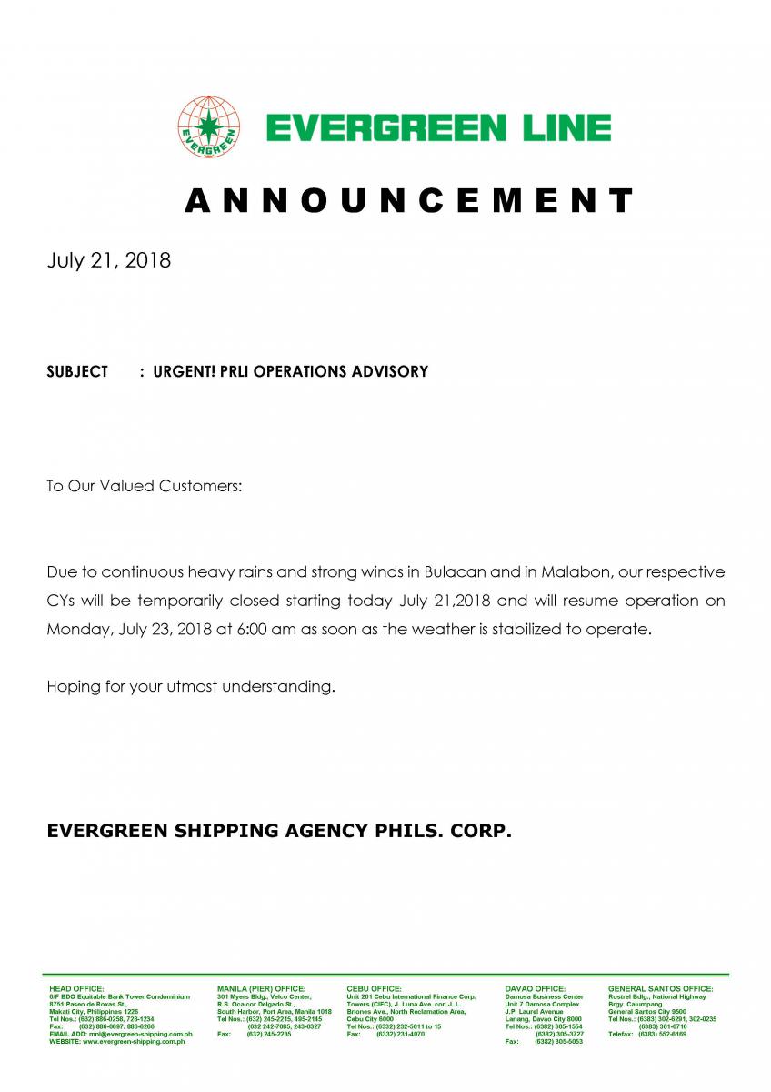 URGENT!! PRLI OPERATIONS ADVISORY JULY 21 2018