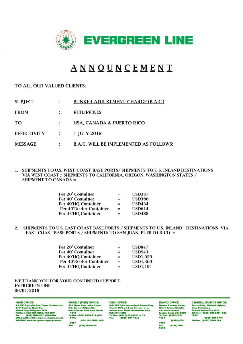 BUNKER ADJUSTMENT CHARGE (B.A.C.) - Philippines to USA, Canada & Puerto Rico Effectivity July 1,2018