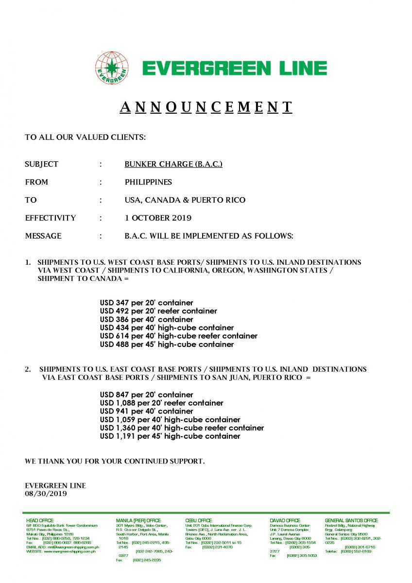 BUNKER CHARGE (B.A.C.) Philippines to USA, Canada & Puerto Rico Effective October 1, 2019
