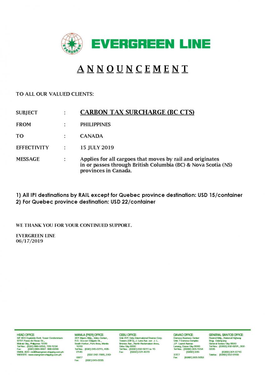 CARBON TAX SURCHARGE (BC CTS) Philippines to Canada Effectivity July 15,2019