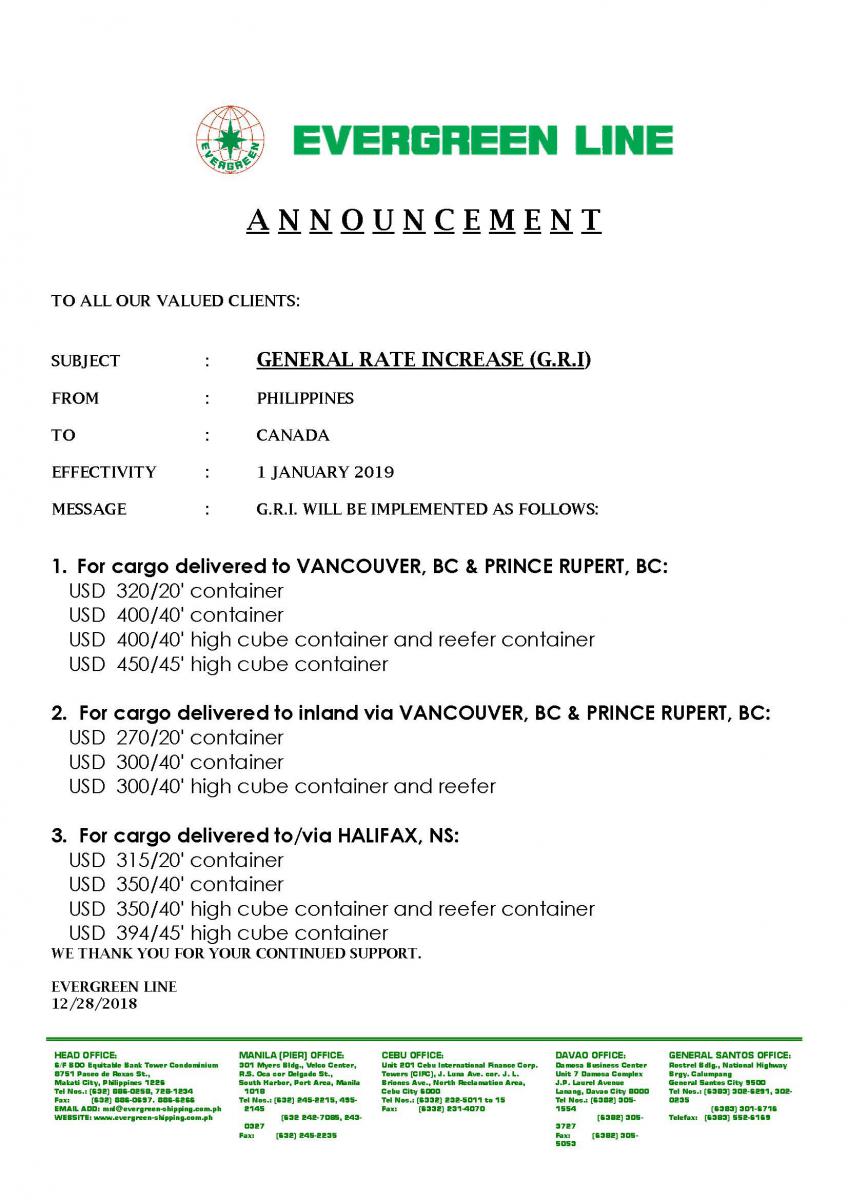 GENERAL RATE INCREASE (G.R.I) Philippines to Canada Effectivity January 1, 2019
