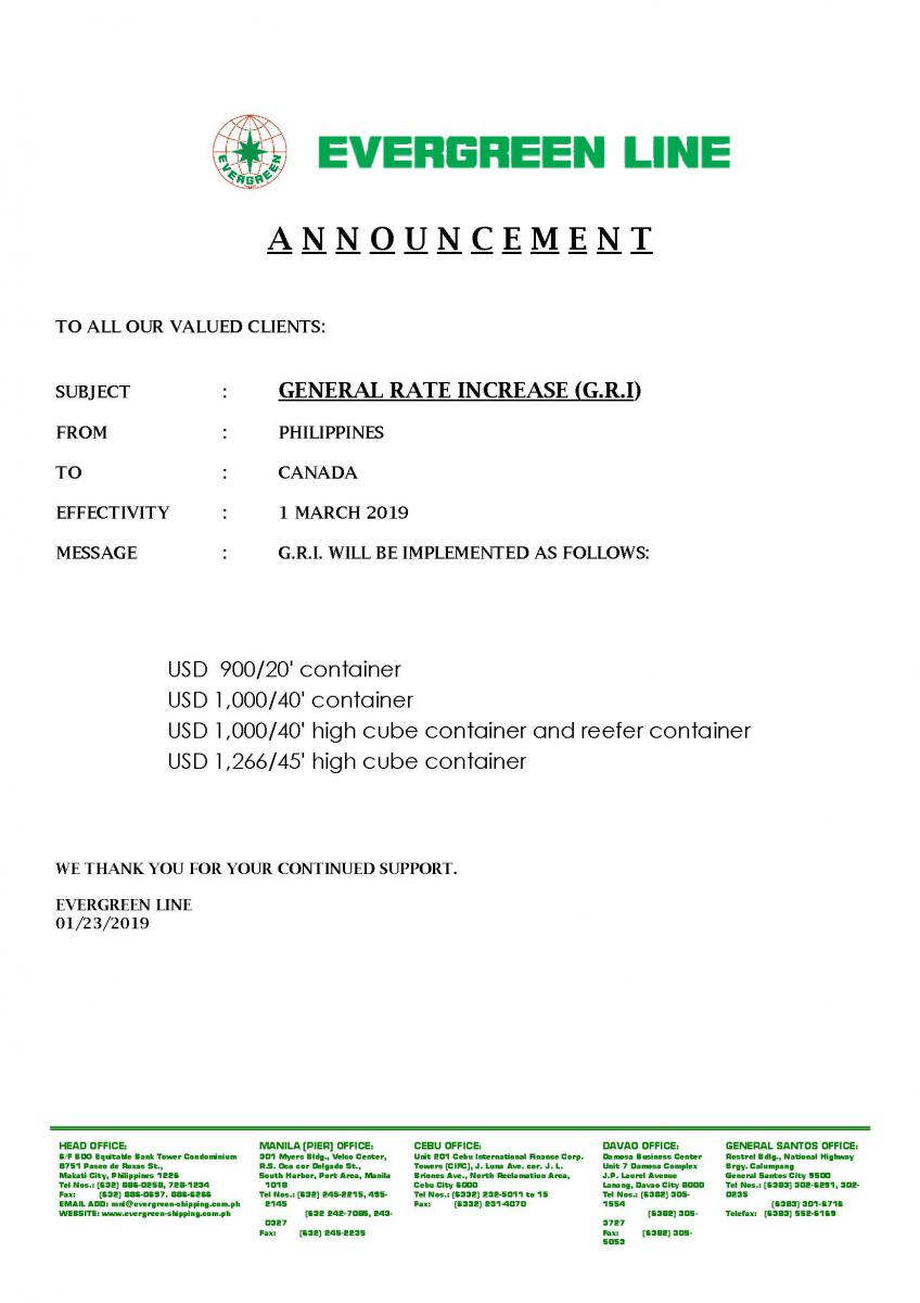 GENERAL RATE INCREASE (G.R.I) Philippines to Canada Effectivity March 1, 2019