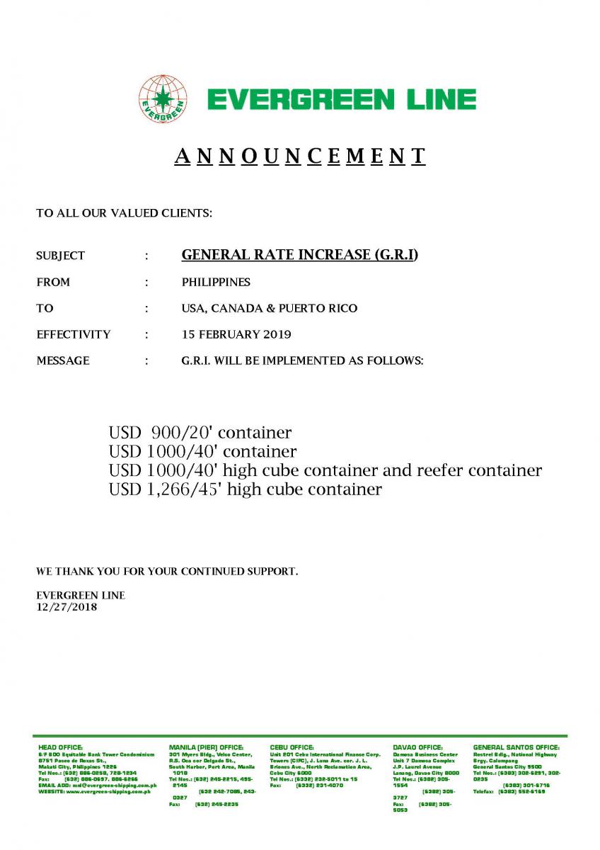 GENERAL RATE INCREASE (G.R.I) Philippines to USA, Canada & Puerto Rico Effectivity February 15, 2019