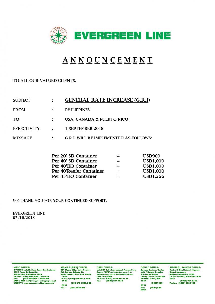 GENERAL RATE INCREASE (G.R.I) Philippines to USA, Canada & Puerto Rico Effectivity September 1, 2018