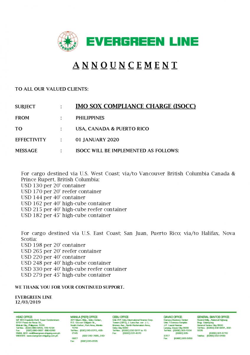 IMO SOX COMPLIANCE CHARGE (ISOCC) Philippines to USA, CANADA & Puerto Rico Effective January 1, 2020